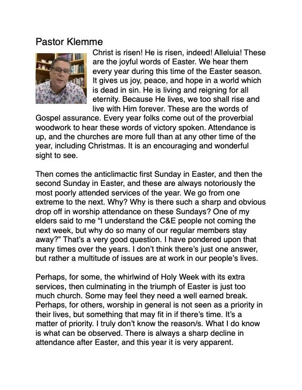 Christ is risen! He is risen, indeed! Alleluia! These are the joyful words of Easter. We hear them every year during this time of the Easter season. It gives us joy, peace, and hope in a world which is dead in sin. He is living and reigning for all eternity. Because He lives, we too shall rise and live with Him forever. These are the words of Gospel assurance. Every year folks come out of the proverbial woodwork to hear these words of victory spoken. Attendance is up, and the churches are more full than at any other time of the year, including Christmas. It is an encouraging and wonderful sight to see.