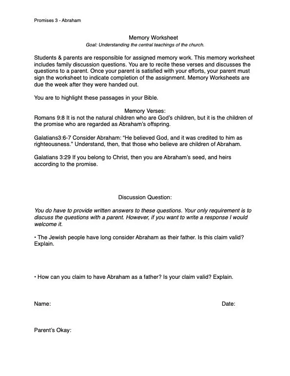 Unit Promises (Abraham) A look into the four part promise given to Abraham and Sarah. With the help of the Holy Spirit, students can come to understand that the promises made by God are fulfilled in Christ Jesus. Given Scripture references The Lutheran Study Bible, Small Catechism, and class discussion, students will appraise how they are connected to the covenant given to Abraham and Sarah and identify the four points of that covenant; Explain with scripture references on how the covenant is fulfilled in Christ Jesus.